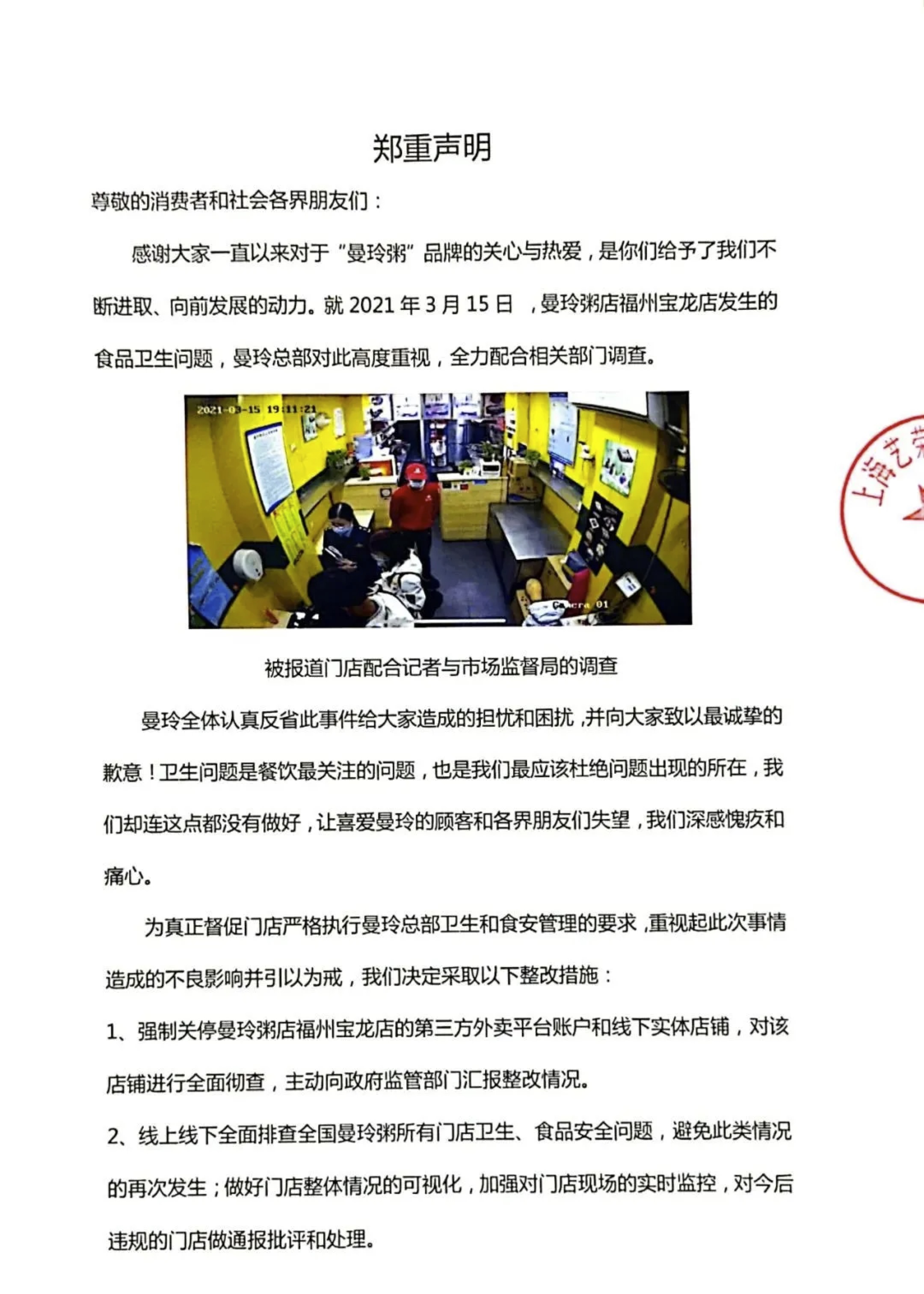 3月16日消息,曼玲餐饮于3月15日晚在其官方微信公众号发布声明称,就2021年3月15日,曼玲粥店福州宝龙店发生的食品卫生问题,曼玲总部对此高度重视,全力配合相关部门调查,并作出整改措施:强制关停曼玲粥店福州宝龙店的第三方外卖平台账户和线下实体店铺,对该店铺进行全面彻查,主动向政府监管部门汇报整改情况;线上线下全面排查全国曼玲粥所有门店卫生、食品安全问题;主动为全国曼玲粥所有加盟门店进行卫生制度管理培训、食品安全、卫生操作培训,为期3个月完成。
