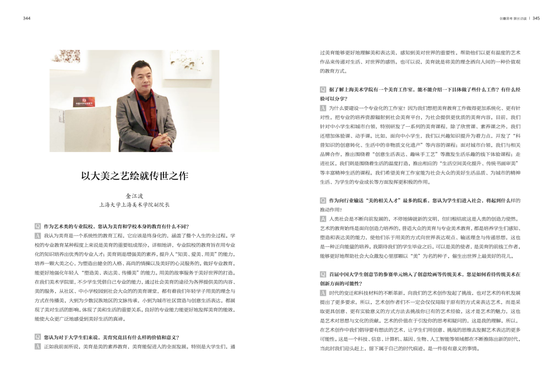 作为本书的主编,王登峰司长在书中对当代高校美育目标和功能进行了诠释。他指出,中国大学生创意节的举办标志着高等院校的美育教育工作与大学生的创意文化活动已经全面融入大学生的生活,他希望以此为起点,引领中国大学美育教育发展的潮流,实现美育生活化、生活美育化的目标。这一科学论断为高校如何做好美育工作指明了方向、打开了视野。