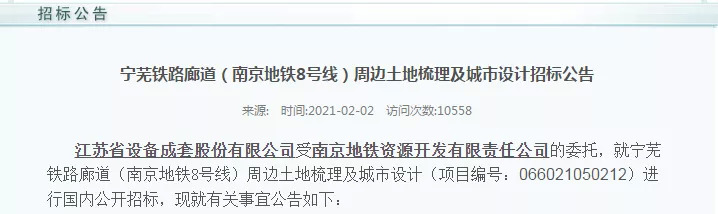 今年2月2日,南京地铁官网发布了《宁芜铁路廊道(南京地铁8号线)周边土地梳理及城市设计招标公告》。