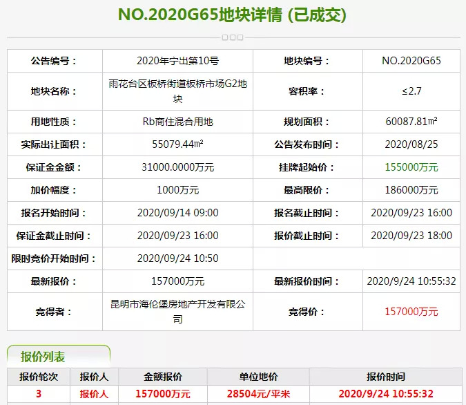 2020年9月24日,海伦堡以总价15.7亿元拿下,成交楼面价10557元/㎡,未来毛坯房销售限价23000元/㎡。