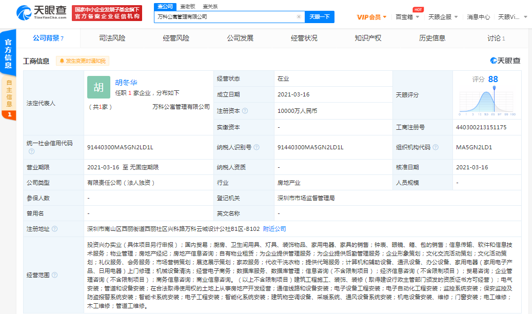 据天眼查APP显示,3月16日,万科公寓管理有限公司成立,注册资本为1亿人民币,法定代表人为胡冬华,经营范围包括投资兴办实业(具体项目另行申报);国内贸易;信息传输、软件和信息技术服务;经营电子商务;数据库服务、数据库管理等。股东信息显示,该公司由万科企业股份有限公司全资控股。