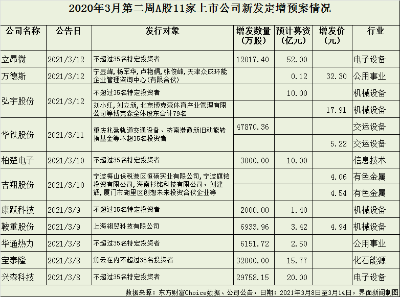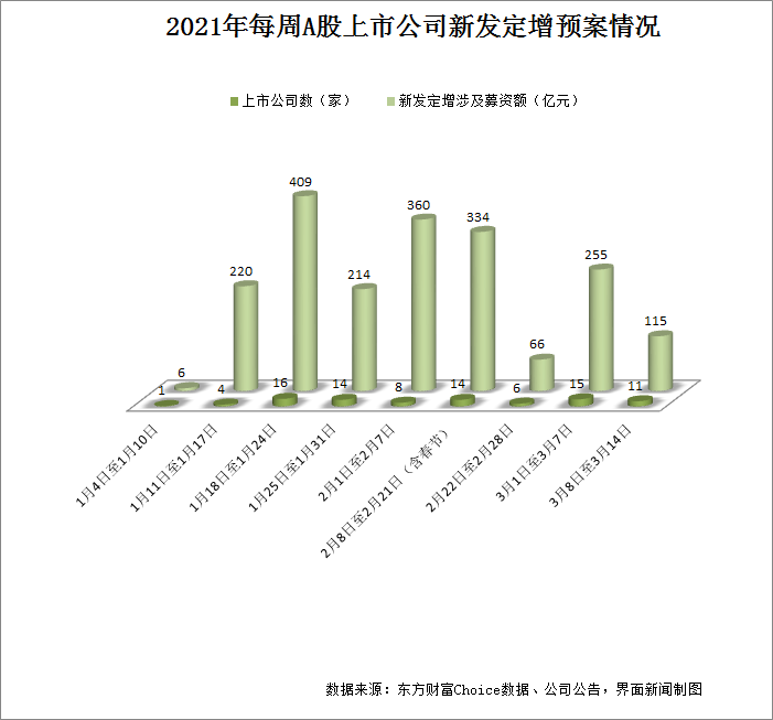 上周(2021年3月8日至3月14日),11家A股上市公司发布新的定增募资计划,已披露募资额合计约115.21亿元,较2021年3月第一周的255.2亿元拟定增募资额“缩水”过半。