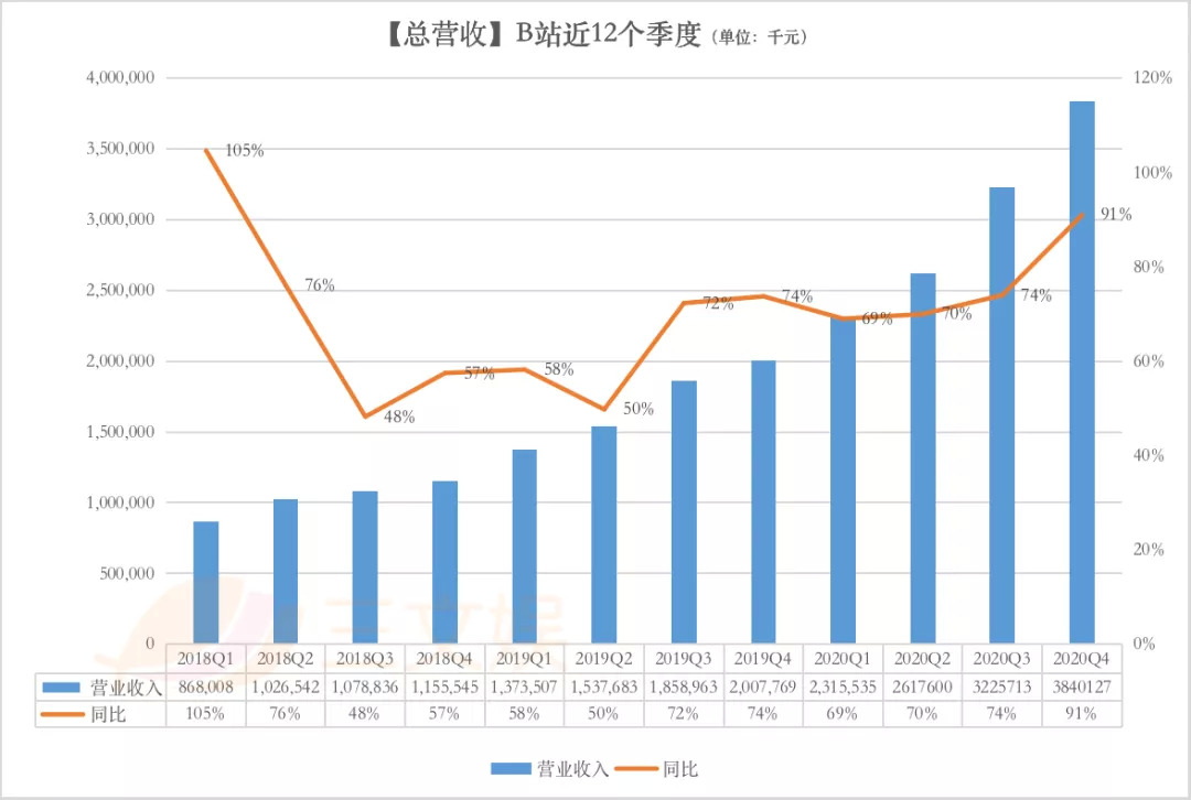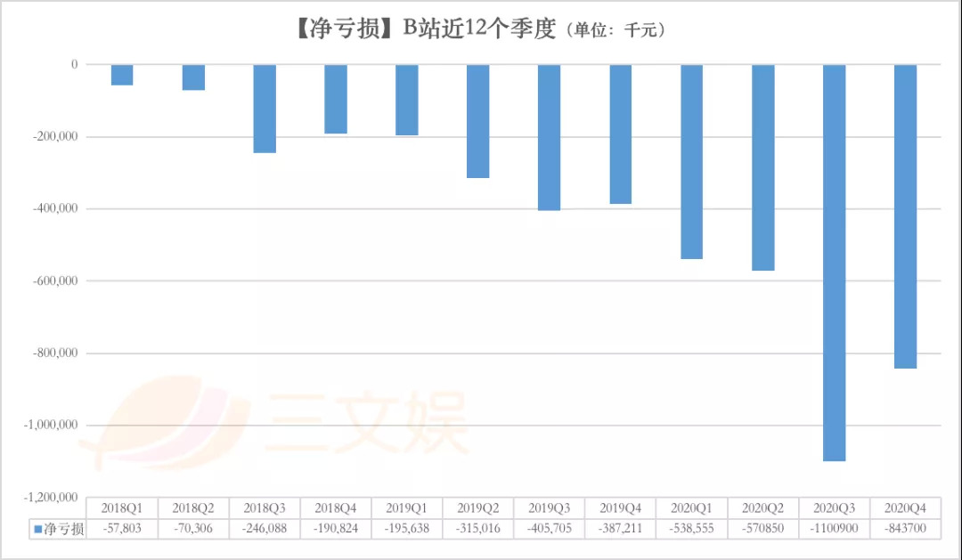 根据B站财务报告,其2020总营收同比增长77%至120亿元,其中第四季度营收同比增长91%,至38.4亿元。2020年净亏损为31亿元,2019年是13亿元;第四季度净亏损为8.437亿元,2019年同期是3.872亿元。