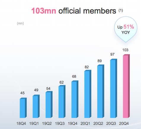 2020年第四季度,B站的用户增长踏上了一个新起点——第四季度,月活用户同比增长55%至2.02亿;其中移动端月活用户同比增长61%至1.87亿。与此同时,日活用户达5400万,实现了42%的同比增长。