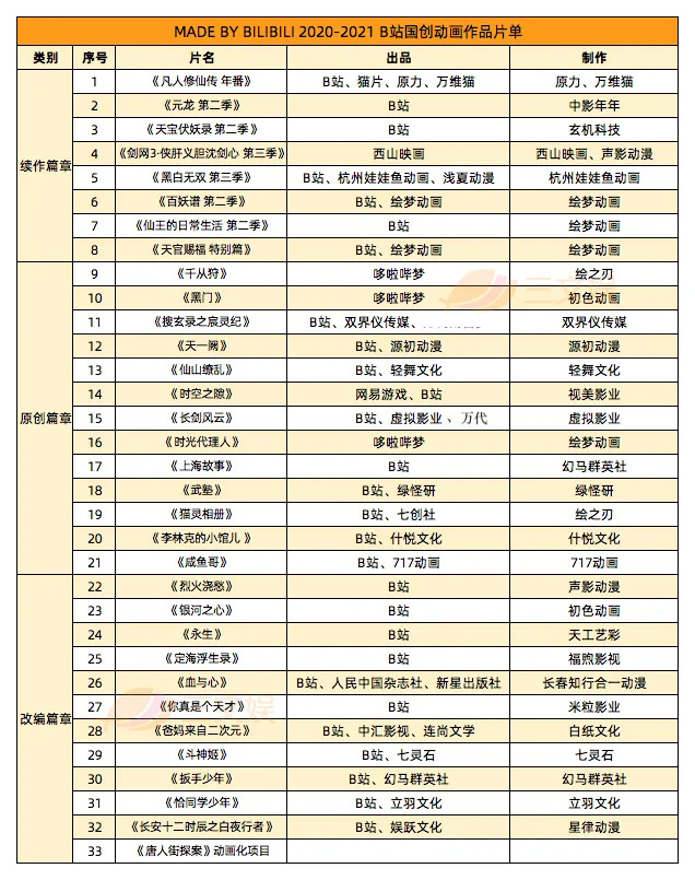 在去年11月的2020-2021国创动画作品发布会,B站又公布了33个动画剧集项目的新进度,还透露已布局的4部国产动画电影。