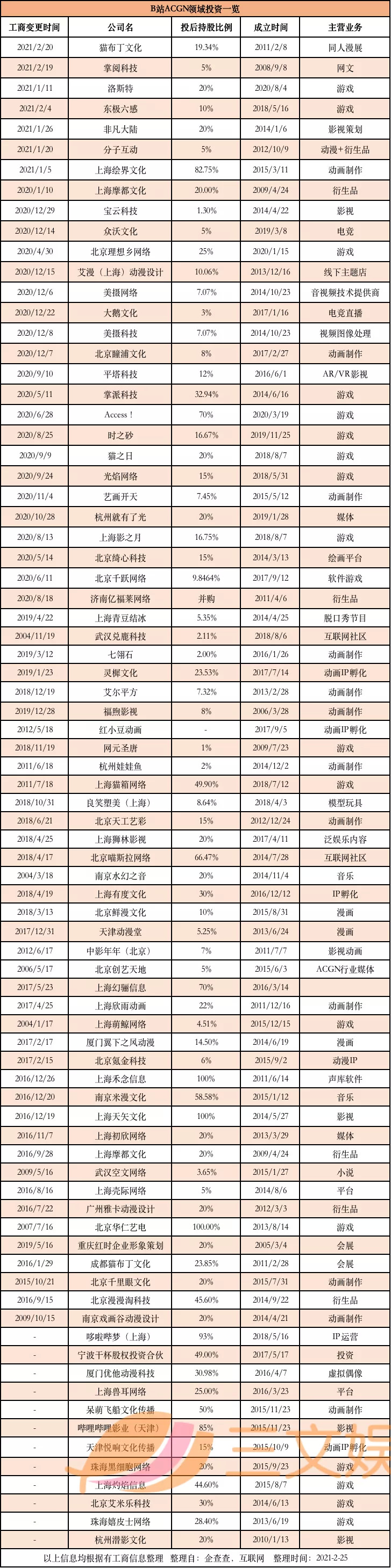 B站直接投资的21家公司,涵盖动画、漫画、消费、手游、MCN等