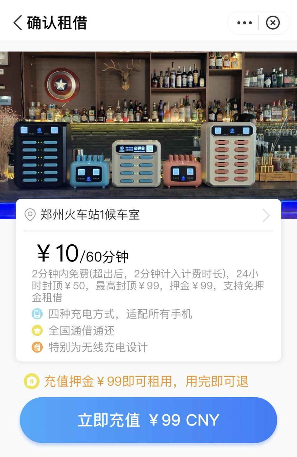 一位网友截图显示,郑州火车站有共享充电宝租赁价格为10元每小时