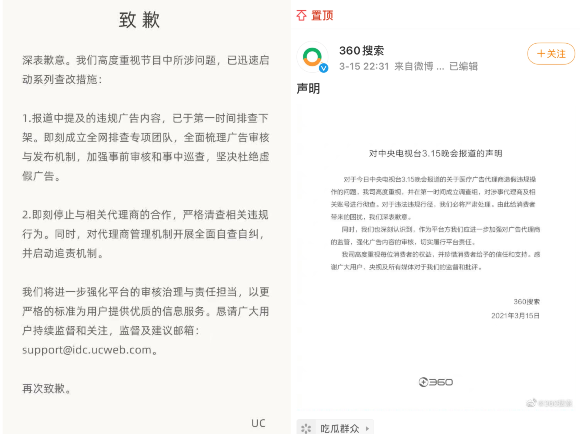 魏则西事件发生五年之后,大众的眼光再次聚焦到搜索引擎中的虚假广告问题上。不过这一次站在舞台中央的是360搜索和UC浏览器。在3.15 晚会上, UC 浏览器和 360 浏览器因涉及为无资质公司投虚假医药广告被点名。