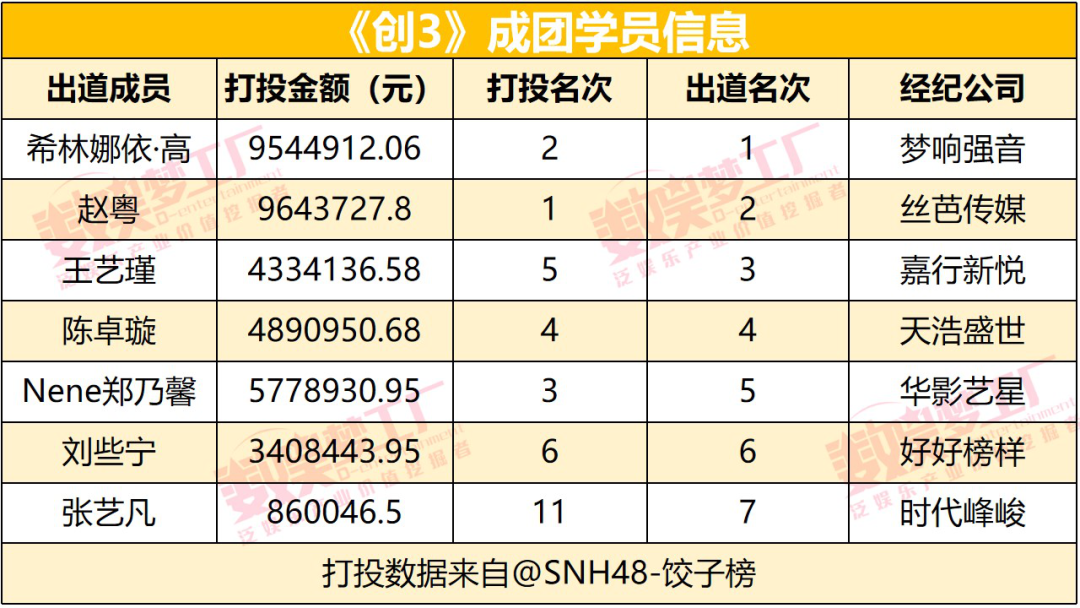 以去年的《创造营2020》为例,前6名成员出道名次与粉丝氪金打投名次相差不大,第7名出道成员张艺凡在粉丝氪金打投榜排名第11位,而她所在的经纪公司是成功推出过TFBOYS的时代峰峻,拥有头部练习生资源、偶像团体运作经验及行业影响力,这些因素很可能成为平台方眼中的加分项。