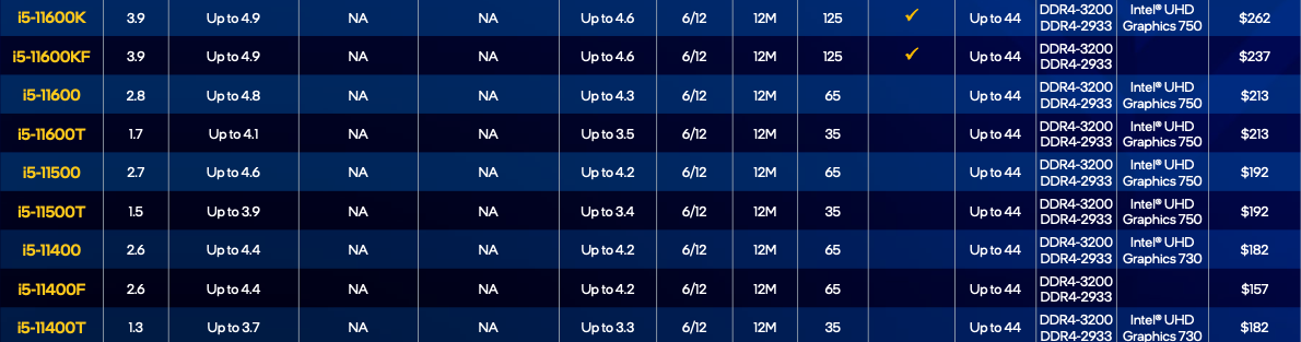 好了不开玩笑了,目前11代英特尔桌面处理器仅发布了酷睿(Core)系列,共有19个SKU,其中根据级别可以分为i5、i7与i9三个档次,部分型号提供K/F/KF/T系分支,其中最高端型号为i9-10900K,入门型号为i5-11400T。