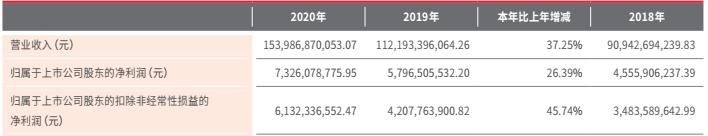 2020年,公司实现总营业收入1539.87亿元,同比增长37.25%;实现归属于上市公司股东的净利润73.26亿元,同比增长26.39%;扣除非经常性损益后归属于上市公司股东的净利润61.32亿元,同比增长45.74%。