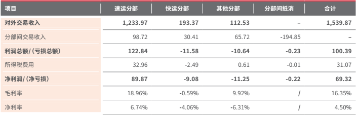 就利润而言,2020年公司实现利润总额100.39亿元,其中速运分部实现利润总额122.84亿元;快运分部及其他分部亏损总额分别为-11.58亿元和-10.64亿元。