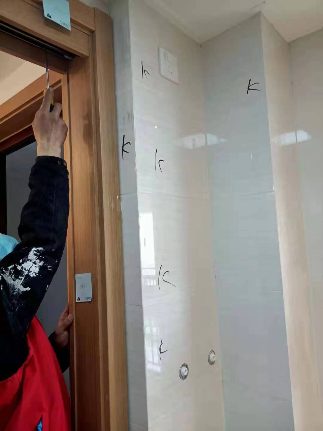 界面山东和验房师随业主进入家中后,验房师首先拿出激光标线仪检查房屋净高、各个房间的使用面积。在详细记录了基础测量数据后,验房师李永强开始检查门窗,结果发现了很多问题。其中,入户门的外门套与墙面闪缝、门槛与地面闪缝、内门套两侧松动;西南卧、北卧、东南卧和客卫等多个门扇都存在密封不严、门套松动的问题。