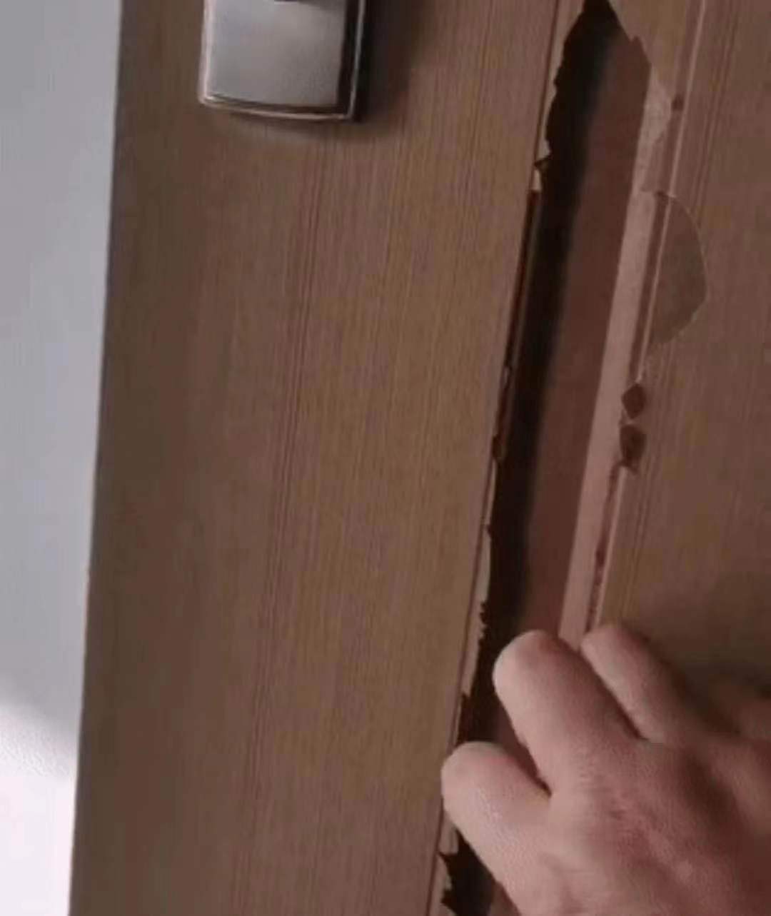 从微信公众号发布视频截图中可以看到,一名业主从木门破裂处轻轻撕拽木门贴皮,结果这木门的贴皮竟然像纸片一样被轻松撕下,露出粗糙的内芯。