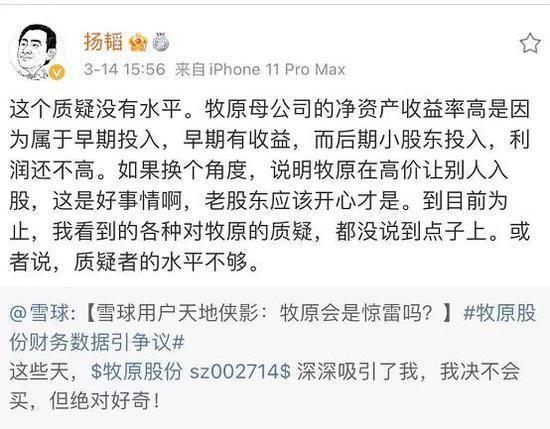 此前的3月13日,雪球雪球上拥有8.8万粉丝的大V“天地侠影”发布的《牧原会是惊雷吗?》一文,直指牧原股份固定资产占销售收入比重高于同行、与牧原建筑之间存在大量关联交易、公司少数股东ROE远低于母公司股东ROE等。