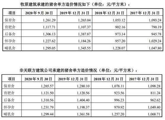 数据显示,牧原建筑的猪舍单方造价平均数在979至1230元之间,而非关联方的单方造价平均数在994至1247元之间。牧原股份认为,双方差异率较小,关联交易价格公允。