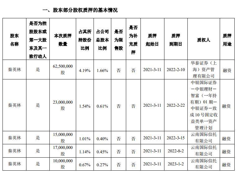 秦英林于2021年3月11日质押约1.28亿股,占其所持股份比例为8.55%。牧原集团于2021年3月11日质押1900万股,占其所持股份比例为3.89%。质权人包括华泰证券(上海)资产管理有限公司、云南国际信托等,质押用途均为融资。