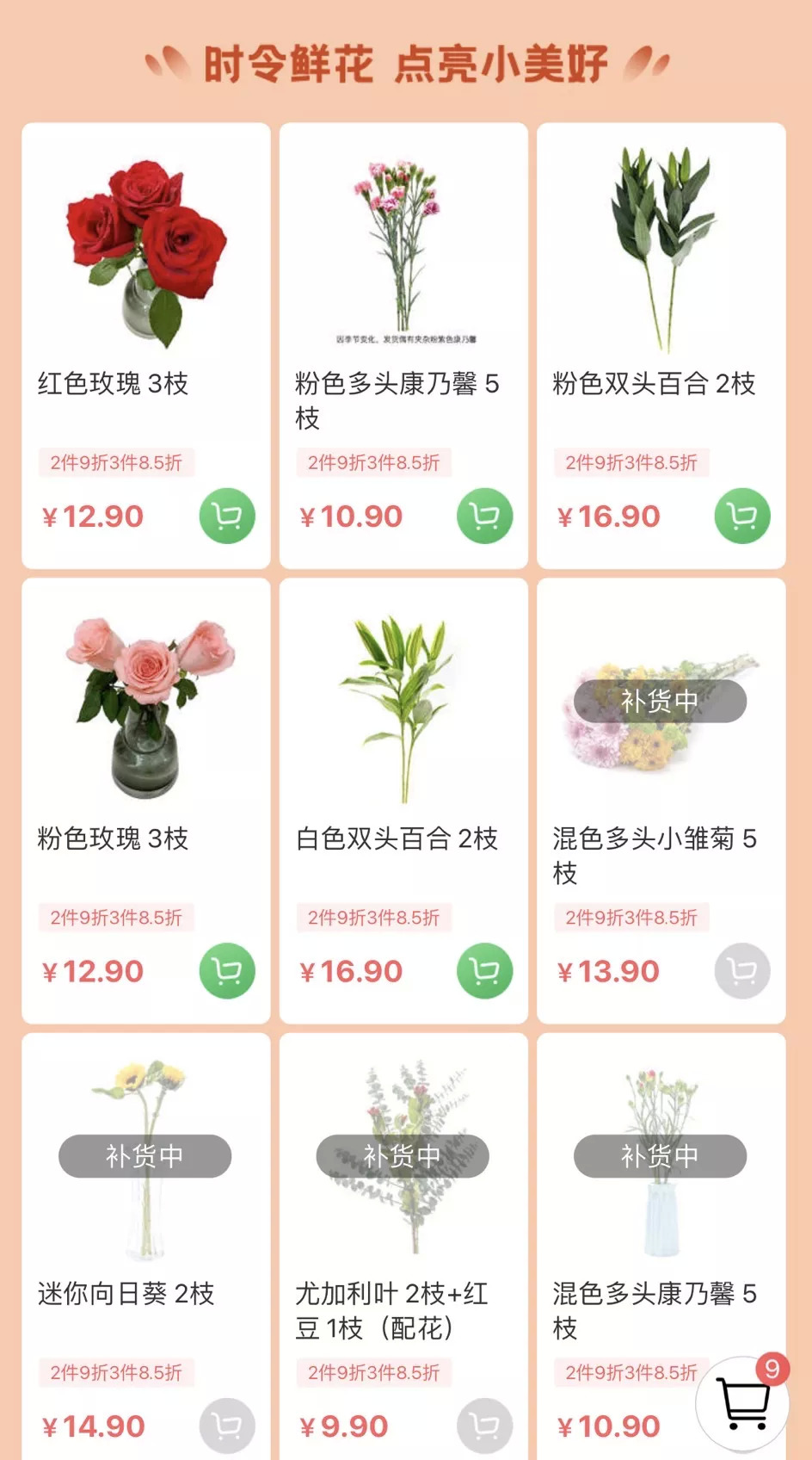 以叮咚买菜北京地区为例,在鲜花类目下,已有十多个SKU,很多热门的鲜花品种,还要靠抢,一上架就售罄。