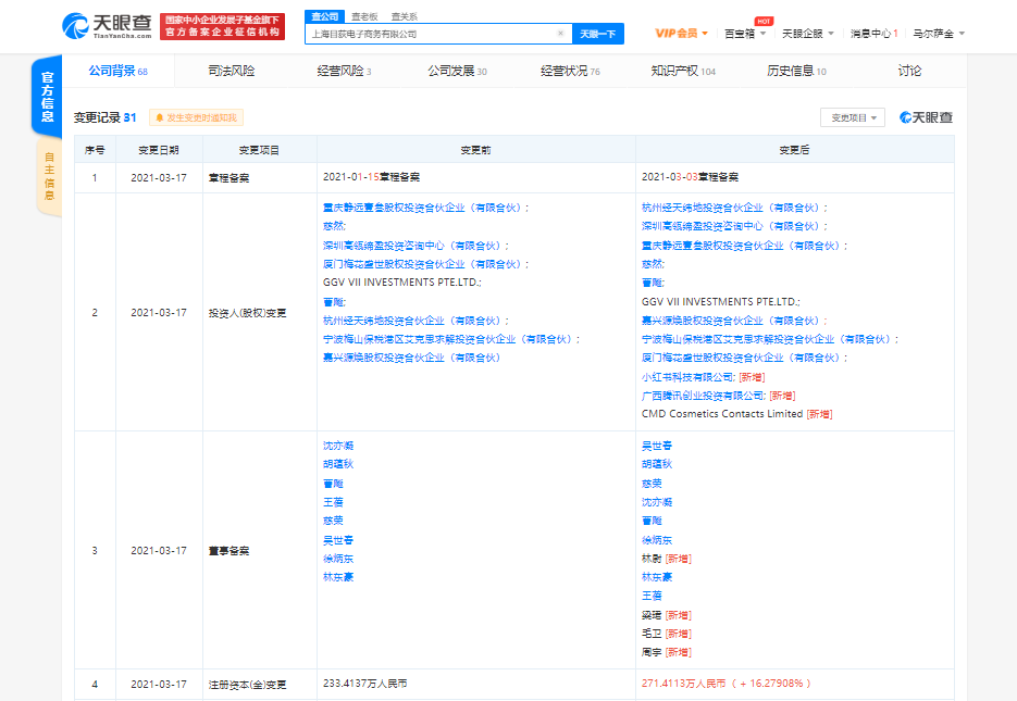 据天眼查APP显示,3月17日,MOODY关联公司上海目荻电子商务有限公司发生多项工商变更,新增股东广西腾讯创业投资有限公司、小红书科技有限公司、CMD Cosmetics Contacts Limited。主要人员新增林尉等人。同时,该公司注册资本由约233.4万人民币增至约271.4万人民币,增幅约16.3%。