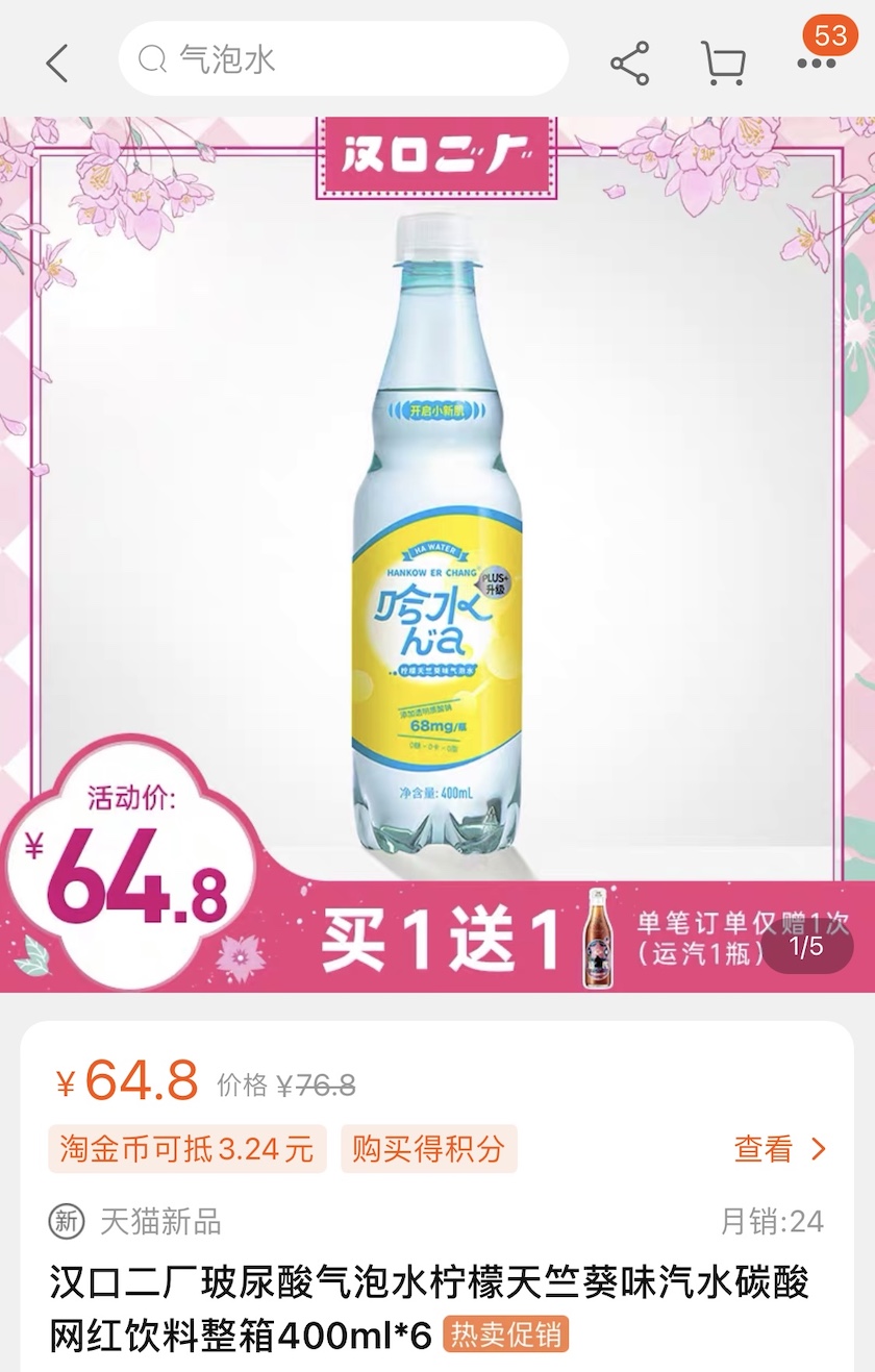 3月17日,汉口二厂在天猫旗舰店上线了一款功能性饮品——玻尿酸气泡水“哈水”。这是国内首批添加了透明质酸钠成分的气泡水产品。