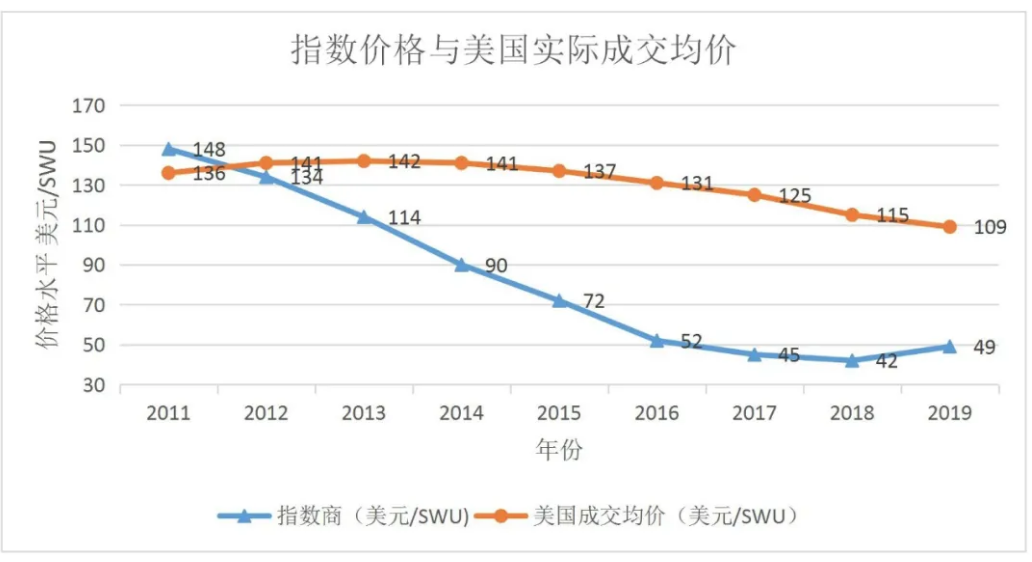 美国能源信息署统计的价格全面反映了当年美国铀浓缩服务实际交易价格,分析表明,这一价格水平与目前国际核燃料价格指数给出的价格在过去几年里是割裂的,甚至相去甚远。