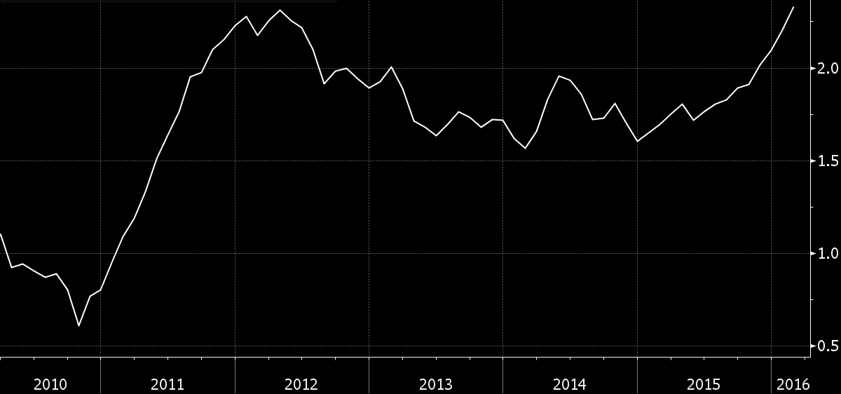 此外,通胀指标已经显示出稳固的上行趋势,这可能会使美联储有口难辩。美联储在上周的利率决策中强调了全球风险,同时维持第四季度核心通胀率为1.6%的预期。这一数字来源于上周三发布的个人消费支出(PCE)价格指数预测中值,核心PCE是美联储政策目标中使用的指标。但问题在于,1月核心PCE已经同比上涨了1.7%。