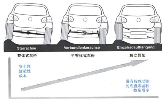 下图展示了三种后悬对安全性、舒适性和成本的影响。我们要讨论的多连杆悬挂属于独立悬挂,而扭转梁悬挂则属于半整体式悬挂,或非独立悬挂。