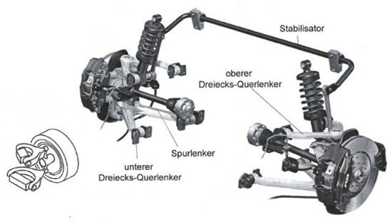 如果车桥只由横置的杆来悬挂,必须有一根杆布置在车轮中心之上,一根杆布置在车轮中心之下,以承受所有的力和力矩。此外还需要一根转向杆,以限制车轮的转向(或使转向成为可能)。这类悬架称为双横臂式悬架。
