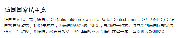 NPD在德国一向声名狼藉。公开发表种族主义言论、仇视外国人、言语威胁有移民背景的他党政治人物或候选人,都是他们的惯用手法。德国政府以及研究德国极右团体的部分学者,更怀疑他们长期以来以合法掩护非法,资助其他的极右暴力组织。