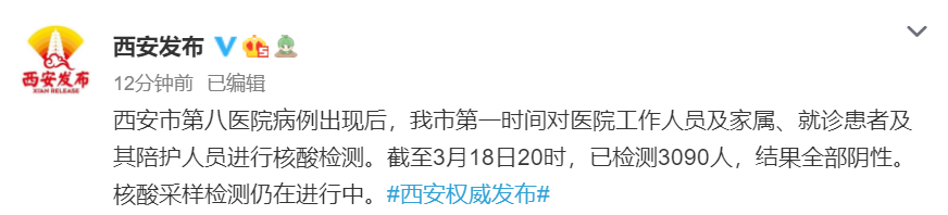据@西安发布 微博消息,3月18日凌晨,西安市第八医院隔离区一名检验师确诊为新冠肺炎病例(普通型)。西安市第八医院病例出现后,西安市第一时间对医院工作人员及家属、就诊患者及其陪护人员进行核酸检测。截至3月18日20时,已检测3090人,结果全部阴性。核酸采样检测仍在进行中。