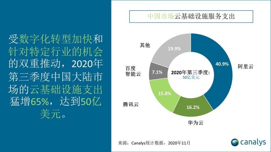 以权威调研机构Canalys发布的2020年第三季度中国云基础设施支出份额来看,阿里云份额40.9%位居榜首,其次是华为云,份额为16.2%,腾讯云凭借15.8%位居第三,百度智能云份额为7.1%。就市场份额来看,阿里云市场地位难以撼动。