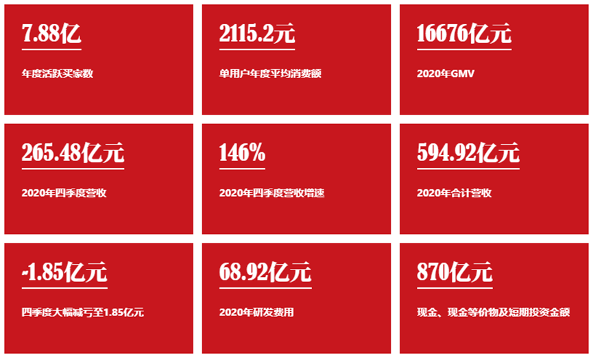 2020年第四季度,拼多多营收增长146%至265.48亿元,全年营收增长97%至594.92亿元。非通用会计准则下(Non-GAAP),拼多多四季度归属于普通股股东的净亏损为1.85亿元,全年归属净亏损为29.65亿元,均较上一年同期大幅收窄。