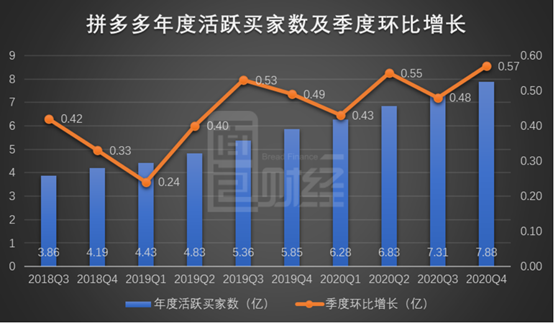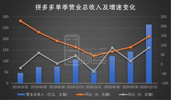 分单季度表现来看,拼多多2020年四个季度的营业收入均保持稳健增长,且同比增长速度有明显加快趋势。