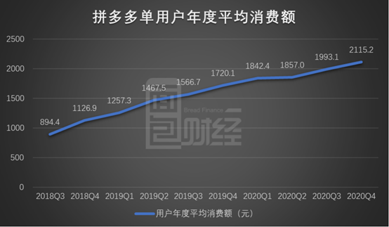 除了活跃买家数的增长,拼多多单用户年度平均消费额也持续上升。翻查历年财报发现,公司单用户年度平均消费额已经从2018年三季度时不足1000元上升至2020年四季度时的2115.2元。