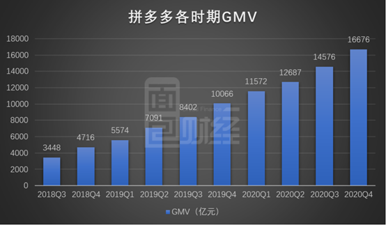 活跃买家数量增长叠加用户平均消费额上升,拼多多GMV(总成交额)在2019年超过1万亿元,正式迈入万亿新台阶。2020年,拼多多的GMV达到16676亿元,同比增长66%。