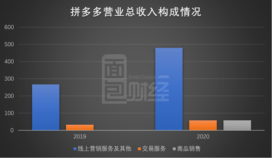 根据财务报告,拼多多2020年在线营销服务及其他业务的营业收入为479.54亿元,相较2019年的268.14亿元增长了78.84%;交易服务的营业收入为57.87亿元,相较2019年的33.28亿元增长了73.89%;商品销售的营业收入为57.51亿元,为2020年新增的收入类型。