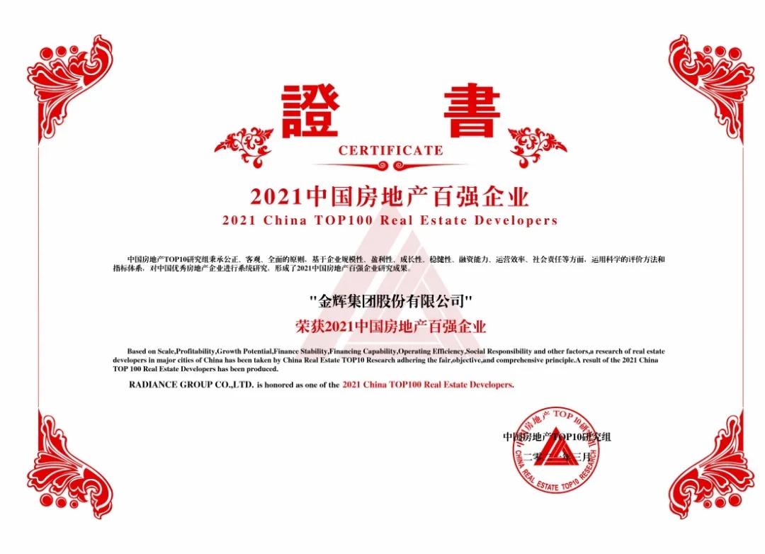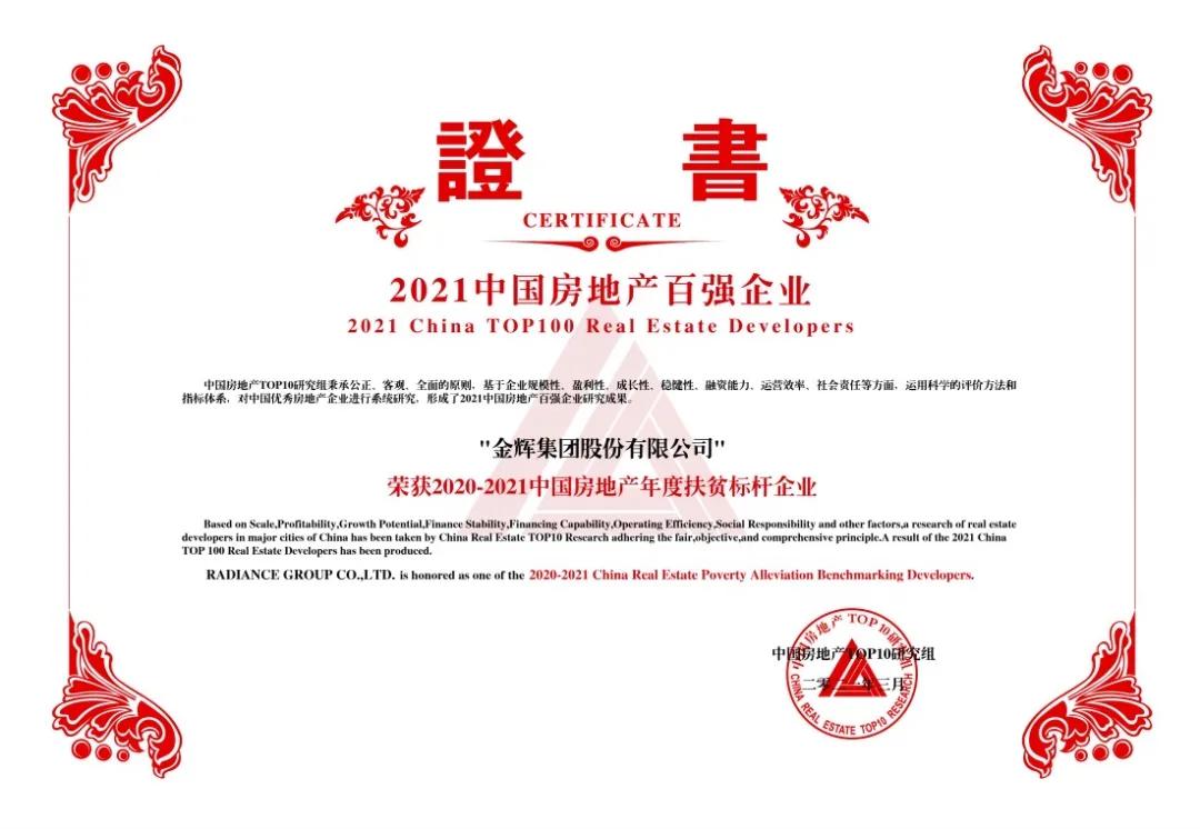 2021年3月18日,由中国企业评价协会、清华大学房地产研究所和中国指数研究院联合举办的“2021中国房地产百强企业研究成果发布会”在北京举行。面对复杂的市场环境,金辉集团全年业绩稳健增长,综合实力不断提升,荣登“2021中国特色地产运营优秀企业TOP1”;“2021中国房地产百强企业TOP37”;并获得“2020-2021中国房地产年度扶贫标杆企业”等多项荣誉。