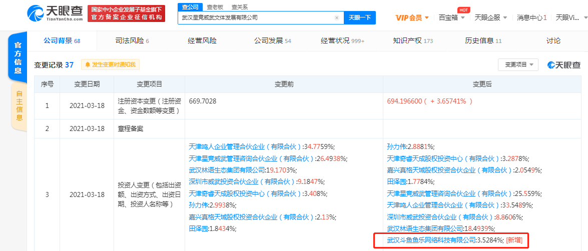据天眼查APP显示,3月18日,武汉星竞威武文体发展有限公司发生工商变更,新增武汉斗鱼鱼乐网络科技有限公司,同时该公司注册资本由约669万人民币增至约694万人民币,增幅约3.66%。