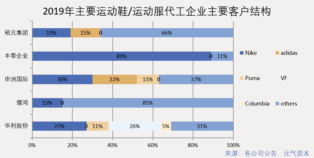 运动鞋代工企业的产业链地位和议价能力普遍低于品牌方。华利股份也不例外,其收入来源较为集中。华利股份是Nike前十大鞋履供应商,公司前五大客户(Nike、VF、Deckers、Puma、Columbia)订单占收入85%。同时公司也是Converse、UGG、Vans、Puma、Columbia、HOKAONEONE、ColeHaan等品牌鞋履产品的最大供应商。
