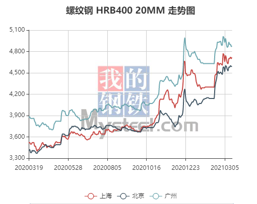 目前钢材价格处于高位。3月初,螺纹钢期货主力合约价格曾创近十年新高。3月19日,黑色期货市场涨跌互现,其中螺纹钢主力合约收盘价为4746元/吨,较昨日下跌0.73%。
