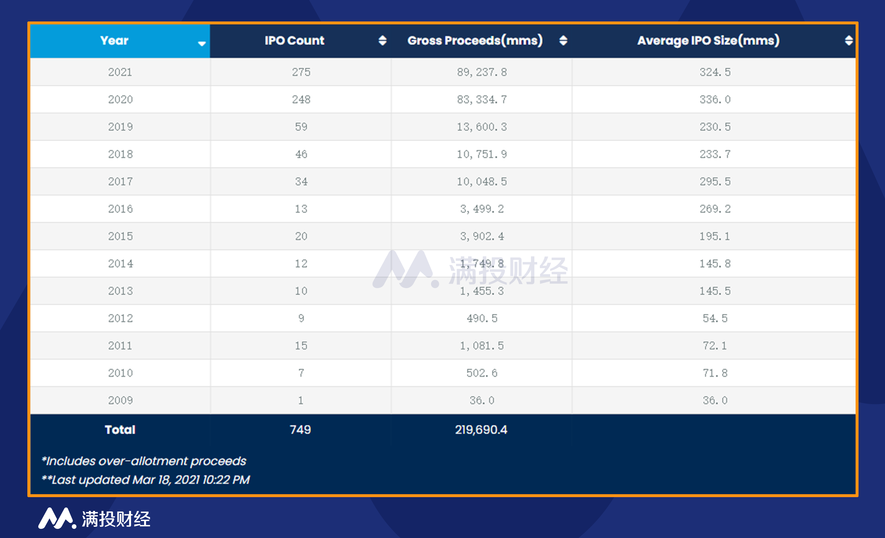 2021年初到现在3个月时间,已经有239家公司成功通过SPAC上市,目前已经超过了2020年的总量。尤其是2019年到2021年间这个数字的增速是很吓人的。相应的募资金额也是逐年增长,第四列是平均金额,不用看也是水涨船高。