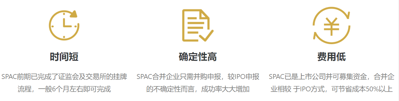 那肯定是方便上市,方便融资,省去了IPO的复杂步骤和巨大的成本,也不用花传统借壳上市的一大笔买“壳”钱,一次融资就能成功上市。而且,SPAC合并目标公司的上市审核较为宽松。虽然SPAC合并交易需经美国证监会和交易所审核,但这种审核远不如IPO审核严格,因此,SPAC作为海外上市的一种途径是非常有优势的。