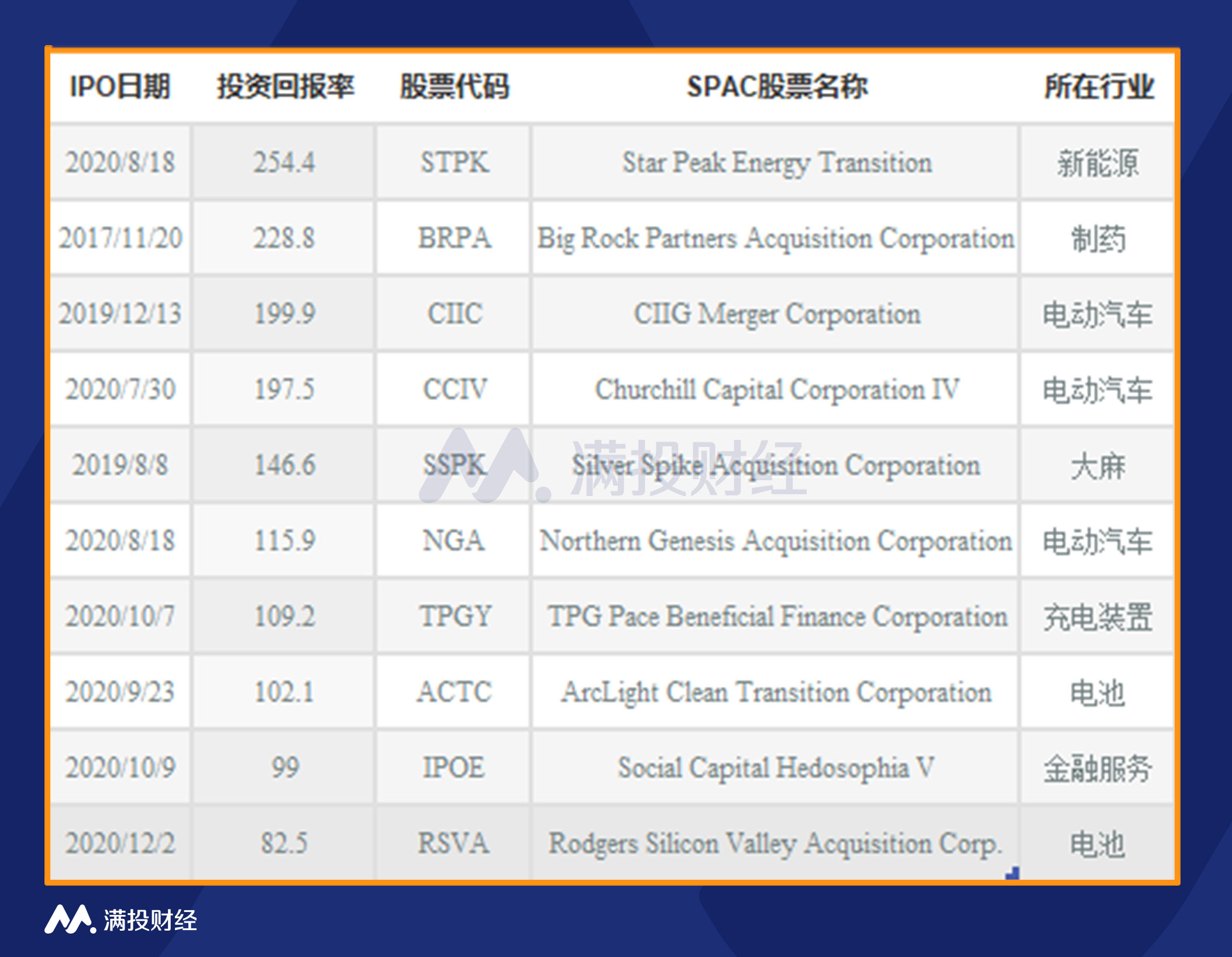 上图为成功合并上市的SPAC公司投资回报率最高的10支股,可以看到其中投资电动汽车的就有3支,新能源、电池相关行业也有涉及。