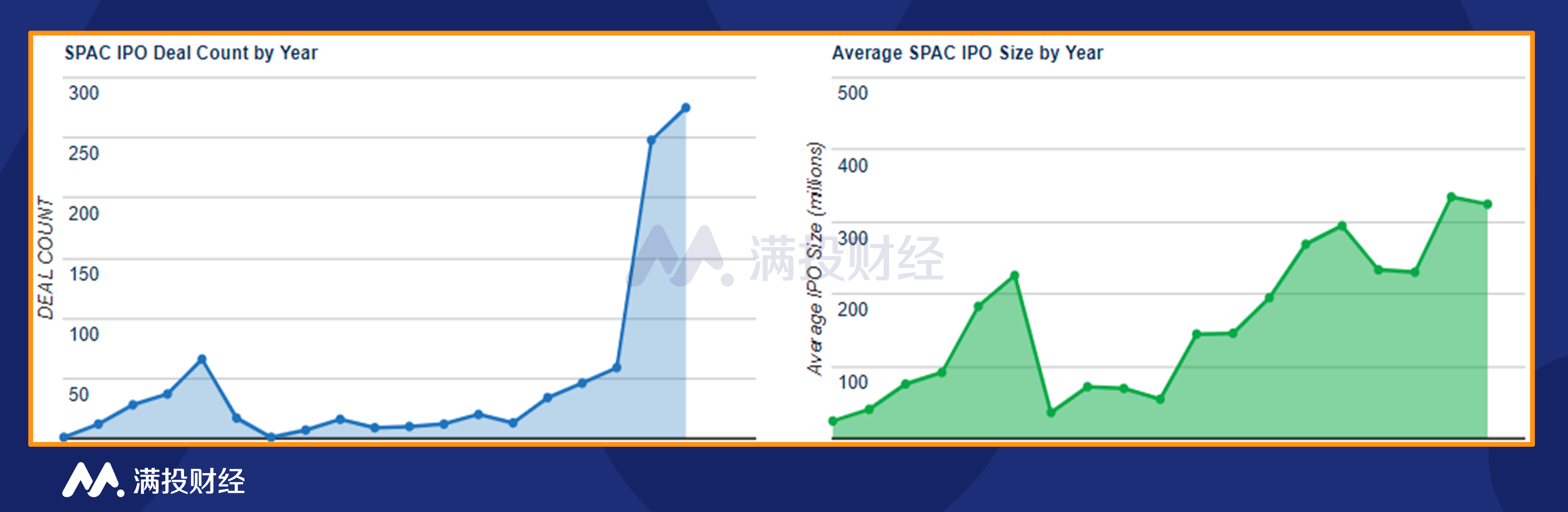 左图是2003至2021年通过SPAC成功上市的公司数量,可见从2016年起至2020年呈加速上升趋势。右图是相同时间下的融资规模。