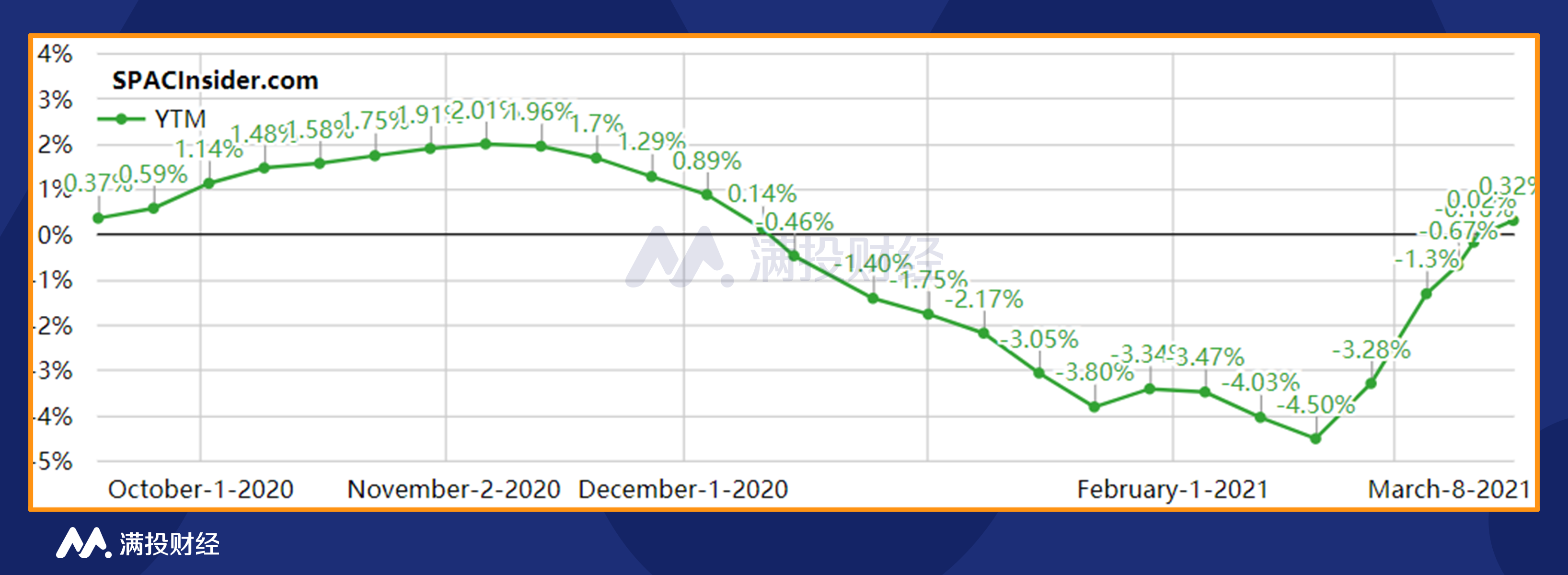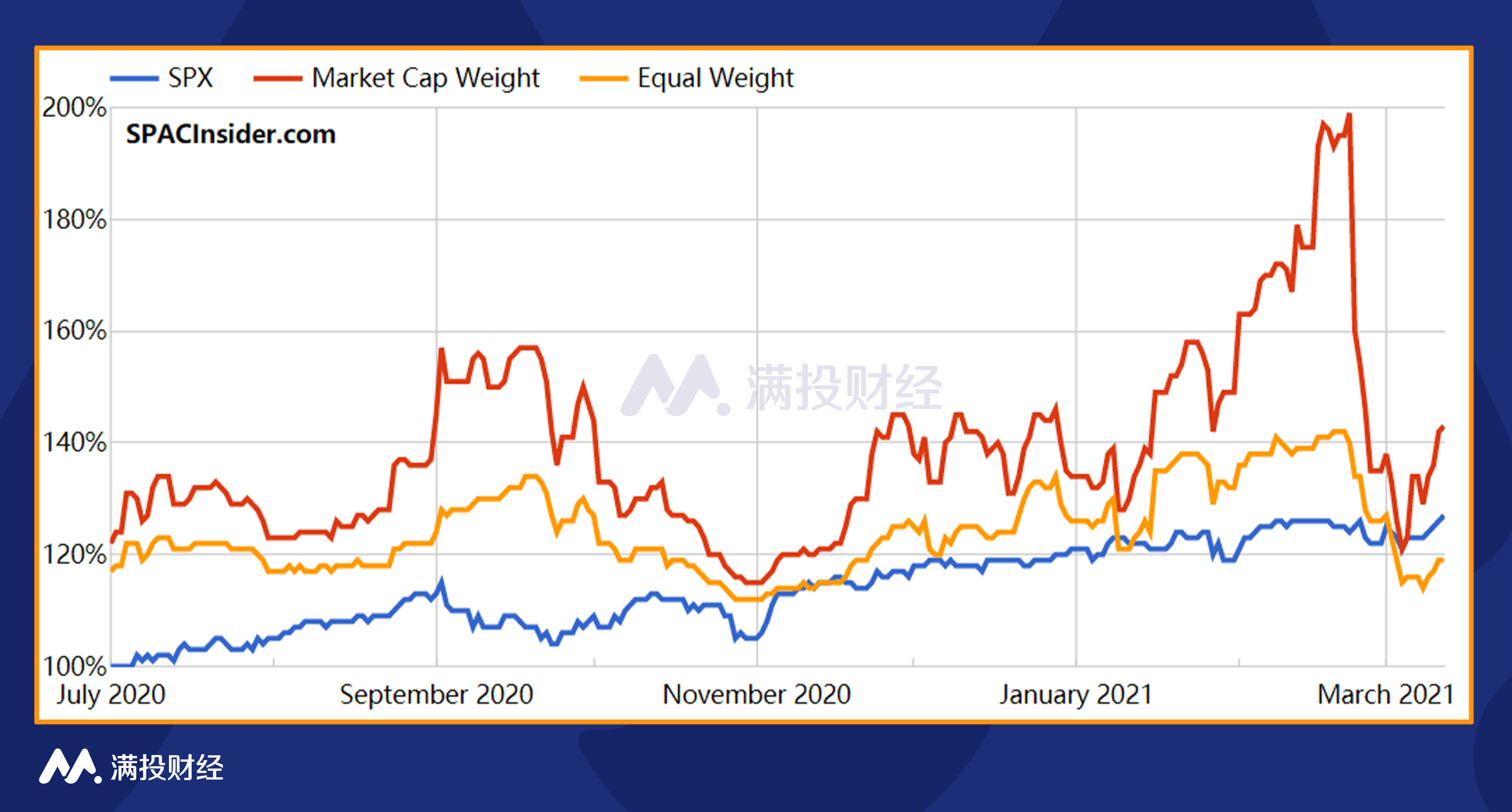 图中是2020年7月到2021年3月,蓝线、黄线、红线分别是SPAC指数、均值、标普500指数,由上图来看,目前SPAC的表现是落后于大盘的。建议投资者做足调研,理性操作。