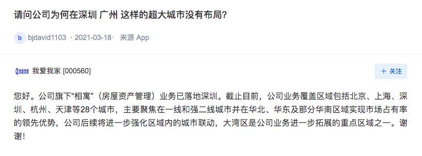 3月20日,我爱我家在互动平台上表示,截止目前,公司业务覆盖区域包括北京、上海、深圳、杭州、天津等28个城市,主要聚焦在一线和强二线城市并在华北、华东及部分华南区域实现市场占有率的领先优势,公司后续将进一步强化区域内的城市联动,大湾区是公司业务进一步拓展的重点区域之一。
