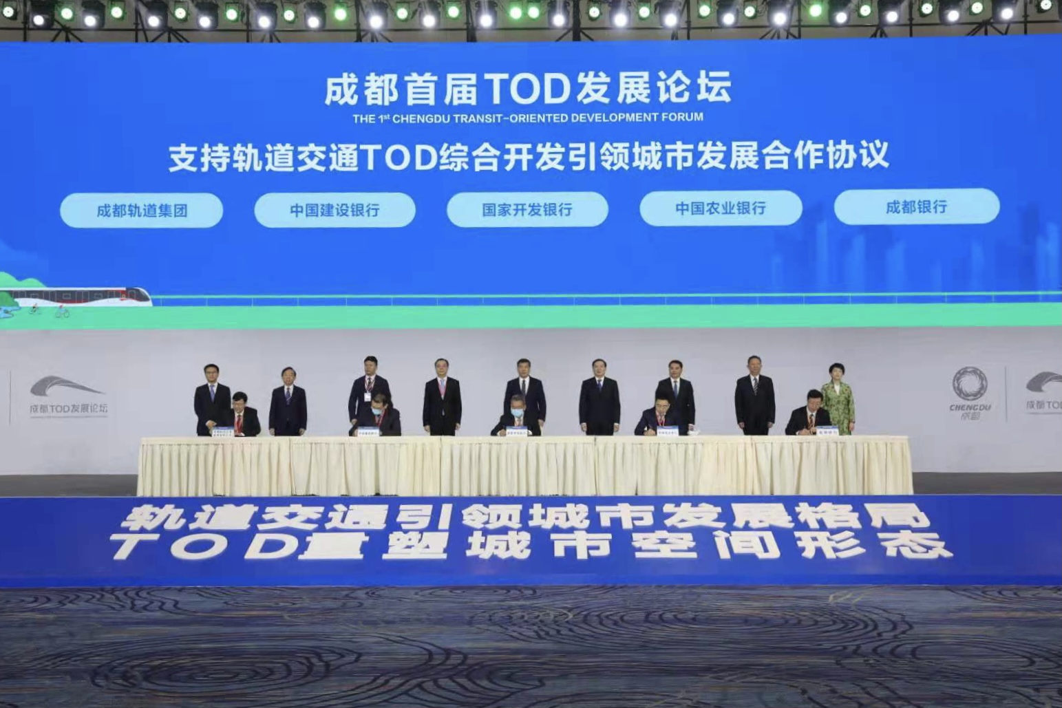 3月20日,成都首届TOD发展论坛在蓉举行。论坛期间,国家开发银行、中国建设银行、中国农业银行、成都银行与成都轨道集团签订支持轨道交通及TOD引领城市发展合作协议,授信额度1000亿;一大批重量级企业与成都TOD签订项目合作协议,总金额超过1500亿。仅在当天上午的集中签约中,成都TOD就已经成功签约16项,协议总金额超过1350亿,合作范围涵盖金融、医疗、酒店、文创、体育、零售等多个领域。