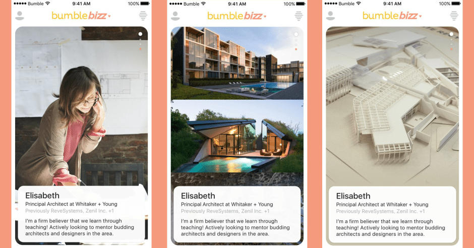 时隔一年,Bumble又推出了企业版Bizz,同样让用户可以在app内选择切换模式进行network,就像约会要填bio一样,用户在这里要上传电子简历和填写技能点等等,和领英主要针对找工作并不同的是,Bumble Bizz更侧重于network和找职业生涯上的导师。