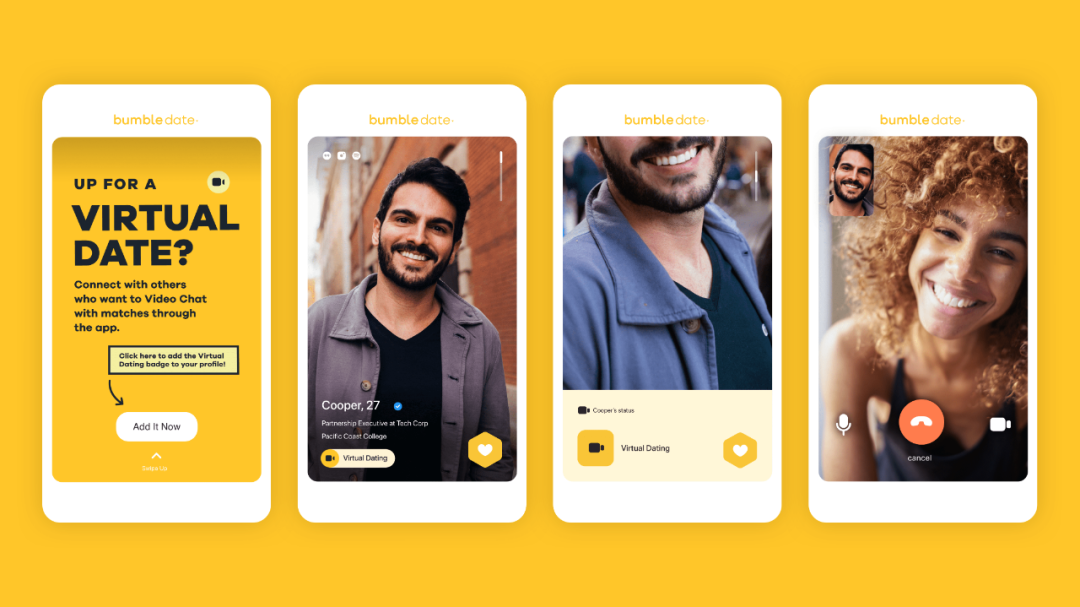 Bumble和许多约会软件一样,抓住了“云约会”这一卖点,在4月就快速推出了视频聊天功能,用户可以将“想聊”勋章添加到自己的档案内,暗示对方自己愿意聊天,光是在去年3月,视频和语音聊天的使用量就增加了93%,同时还推出了像是Tinder Passport的功能,让用户可以跟全国各地的人配对相识。