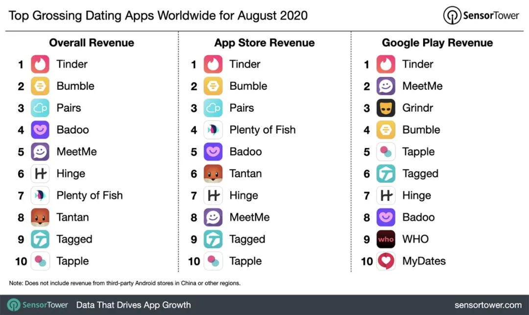 根据Sensor Tower的排名,在全球的社交约会软件营收上,Bumble排名第二,仅次于Tinder,但Bumble在用户和收入增长方面的速度都要快于Tinder。